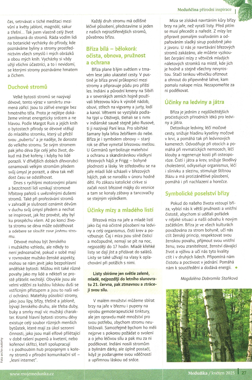 Pro časopis Meduňka 5/2025 jsem napsala článek o dýchání se stromy a komunikaci s bytostmi přírody. Zajímá-li vás toto téma, jste vítání na mých vycházkách a přednáškách, které najdete v aktuálních pozvánkách v kalendáři akcí zde: www.donameduna.cz/kalendar-akci/